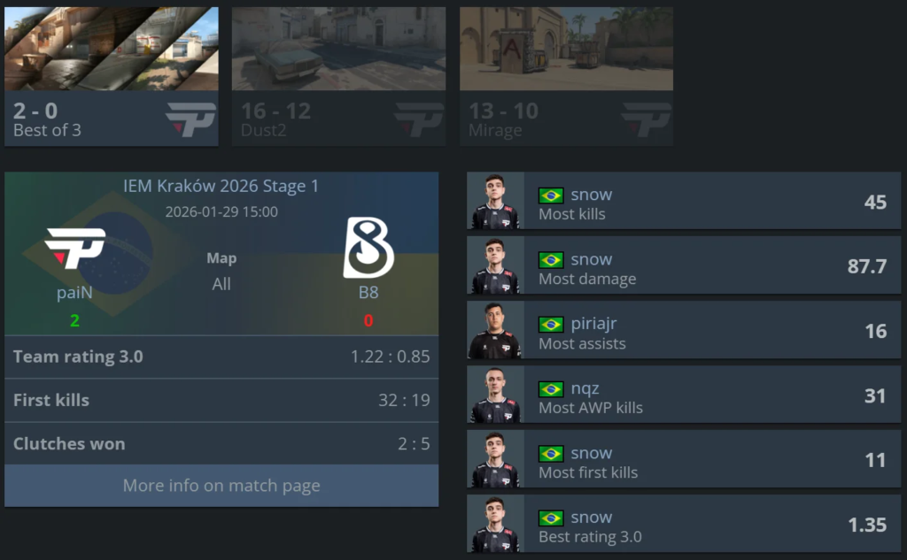 Ukrainian squad B8 have been knocked out of IEM Kraków 2026 after a 0–2 loss to paiN in the Stage 1 lower bracket. With this victory, the Brazilian side advances to the final decisive match for a spot in the next stage.