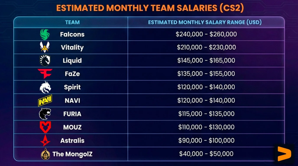 Falcons spend the most, with an estimated $240,000–260,000 per month. The organization has effectively set a new financial benchmark for CS2, assembling a roster built to compete for titles at every tournament.