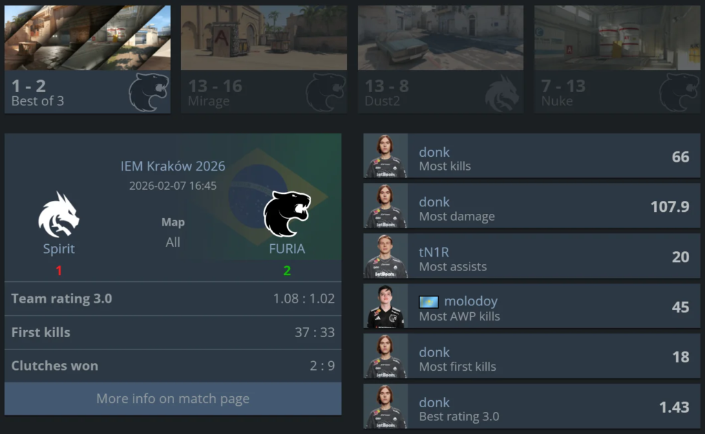 FURIA became the first grand finalists of IEM Krakow 2026 after defeating Spirit 2–1 in the semi-final. The main hero of the series was AWPer Danil “molodoy” Golubenko, who played a decisive role in the victory.