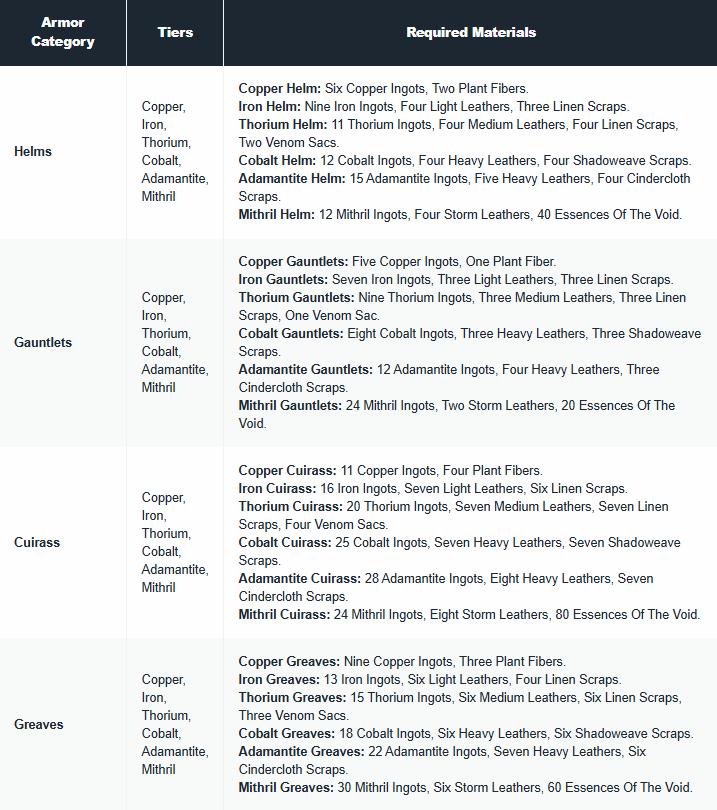 Below is a complete breakdown of every armor tier currently available in the game and the materials required to craft each piece.