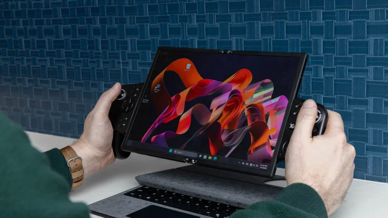 - Folded: The device transforms into a compact handheld console with a 7.7-inch screen. The outer portion of the display (which remains exposed when folded) is designed to turn off to conserve power.