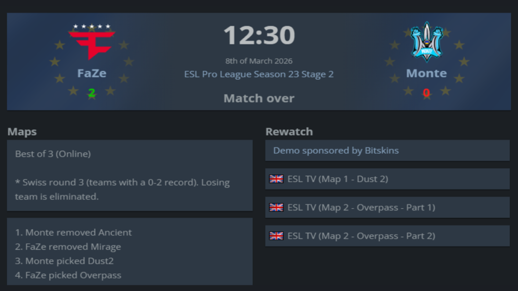 This marks the end of Monte’s run at this tournament. The team was eliminated from the group stage with a 0–3 record in the Swiss system. Their matches were quite intense, especially against strong opponents like FaZe and NaVi, but in the end the team leaves the tournament.