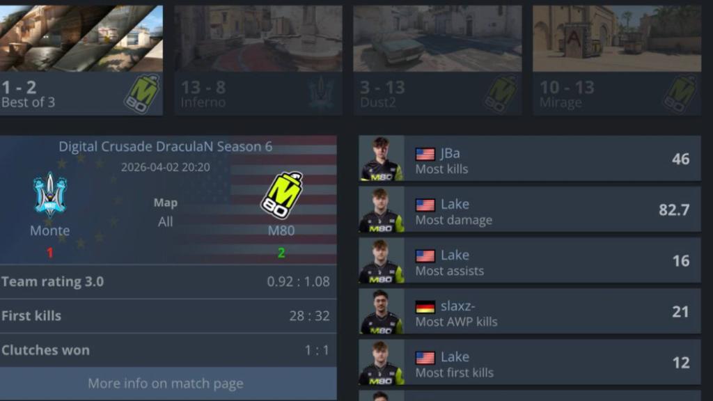 M80 became champions of DracuLan Season 6, defeating Monte in the grand final with a 2–1 scoreline. The American team showed strong resilience, bouncing back after a loss in the upper bracket, where Monte had previously outplayed them. In the decisive match, M80 lost the opening map on Inferno (8:13), but responded confidently on Dust2 (13:3) and closed out the series on Mirage (13:10).