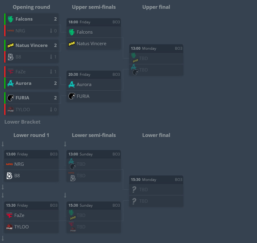 Advanced through the upper bracket: Falcons, NaVi, Aurora, and FURIA.