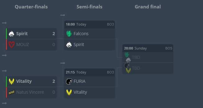Vitality advanced to the semifinals, where they will face the crowd favorites FURIA. Meanwhile, Spirit will play against Falcons for a spot in the final.