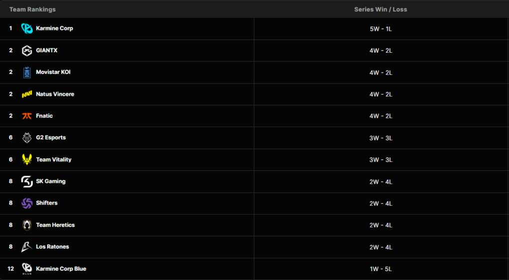 During the second week, Natus Vincere defeated Karmine Corp Blue and SK Gaming, while suffering a loss against Karmine Corp. All matches were played in a best-of-one (bo1) format.