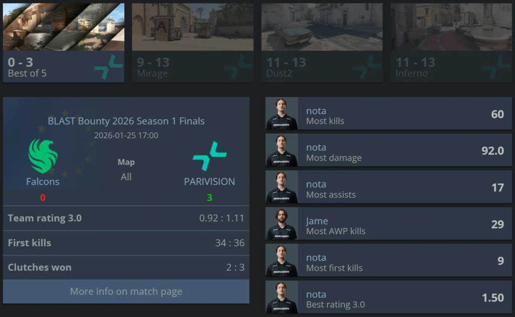 PARIVISION secured the BLAST Bounty 2026 Season 1 title with a convincing 3–0 victory over Falcons in the grand final. The series was played entirely on Jame’s team’s terms, as Falcons failed to put up any real resistance.