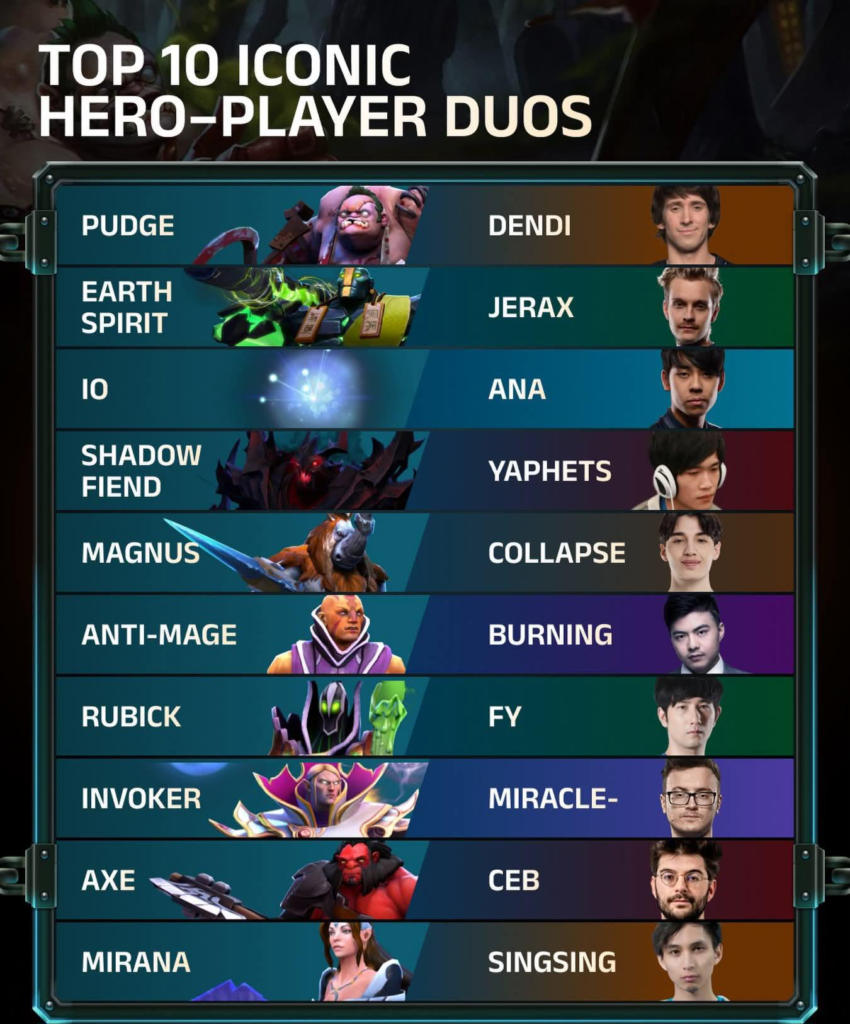 A user on Reddit shared an infographic highlighting the top 10 most iconic and recognizable pairings between professional esports players and their signature heroes Dota 2.