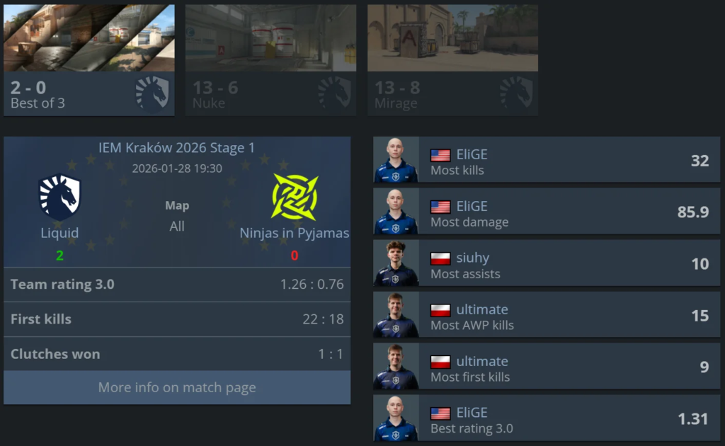 Liquid had no trouble dealing with Ninjas in Pyjamas, once again confirming their edge in the head-to-head matchup. Even with a stand-in, the Americans controlled the flow of the series, and NiP were unable to put up real resistance across two maps, suffering a clean 0–2 defeat.