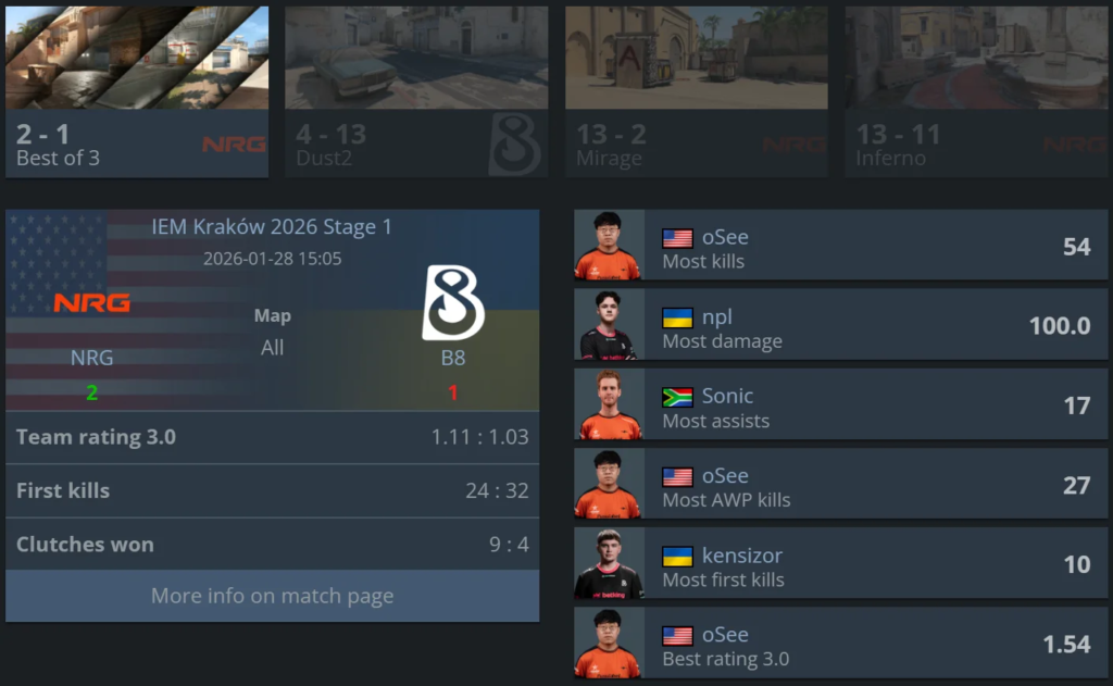 It wasn’t the best start to the tournament for B8 either. The Ukrainian team lost to NRG in a tight three-map series, where oSee’s experience played a key role. Despite attempts to turn the game around on the deciding map, B8 couldn’t close it out and dropped to the lower bracket of Stage 1.