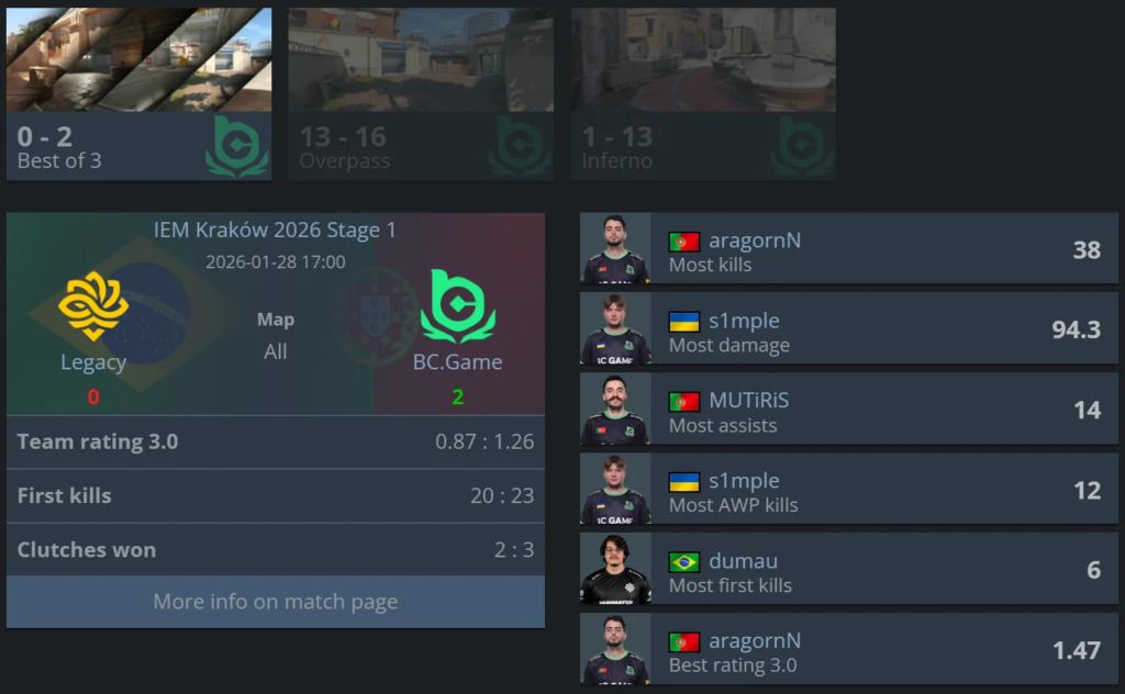 Meanwhile, the real highlight of the day was BC.Game’s performance. The team secured a comeback victory over Legacy, recovering from a large deficit on Overpass and then completely dominating on Inferno. Confident play and a strong finish to the series sent a serious statement from the refreshed roster at this tournament.