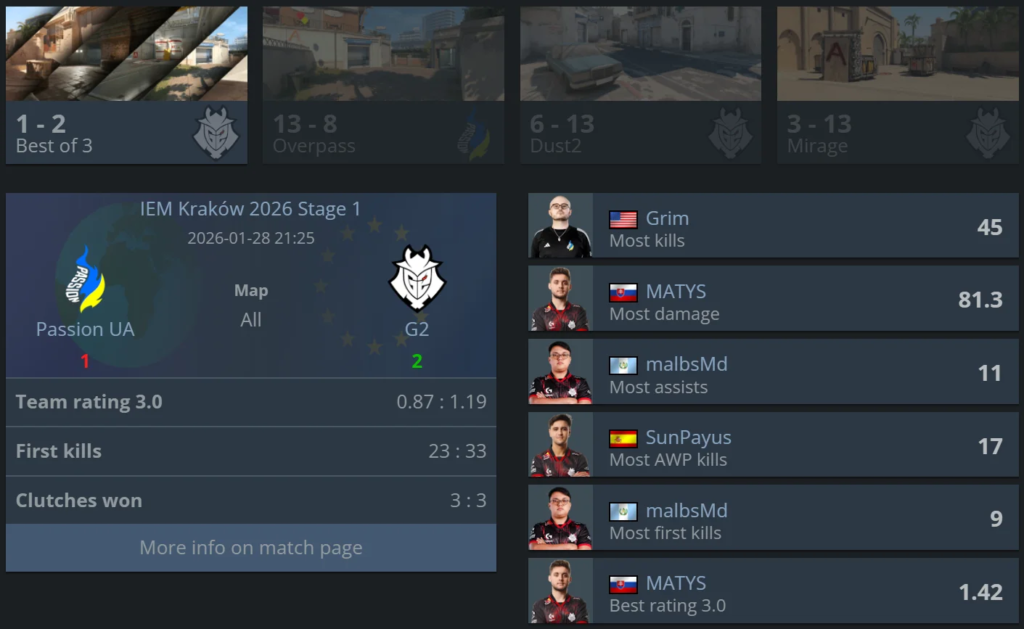 The final match of the day ended with a defeat for the Ukrainian organization Passion UA against G2. Despite a confident win on the first map, they couldn’t build on their success — G2 seized the initiative, won the next two maps, completed the comeback, and took the bo3 series.