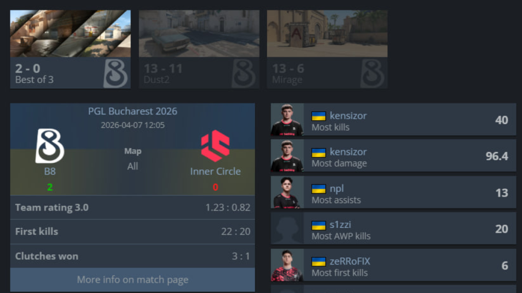 Unfortunately, the match lasted only two maps. Even though Inner Circle showed good CS on Dust2 and fought on equal terms with B8, the 13:11 scoreline in favor of B8 shows that Inner Circle fell just short. On the next map, Mirage, B8 closed it out confidently with a 13:6 score.