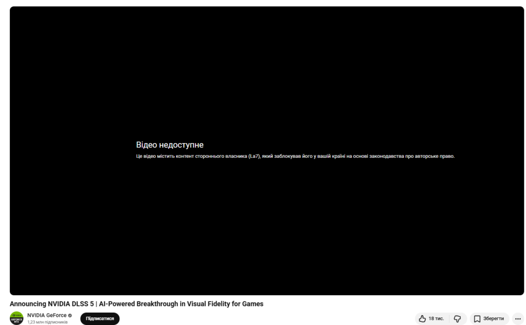 The announcement trailer for NVIDIA DLSS 5 is currently unavailable on YouTube due to a copyright claim.