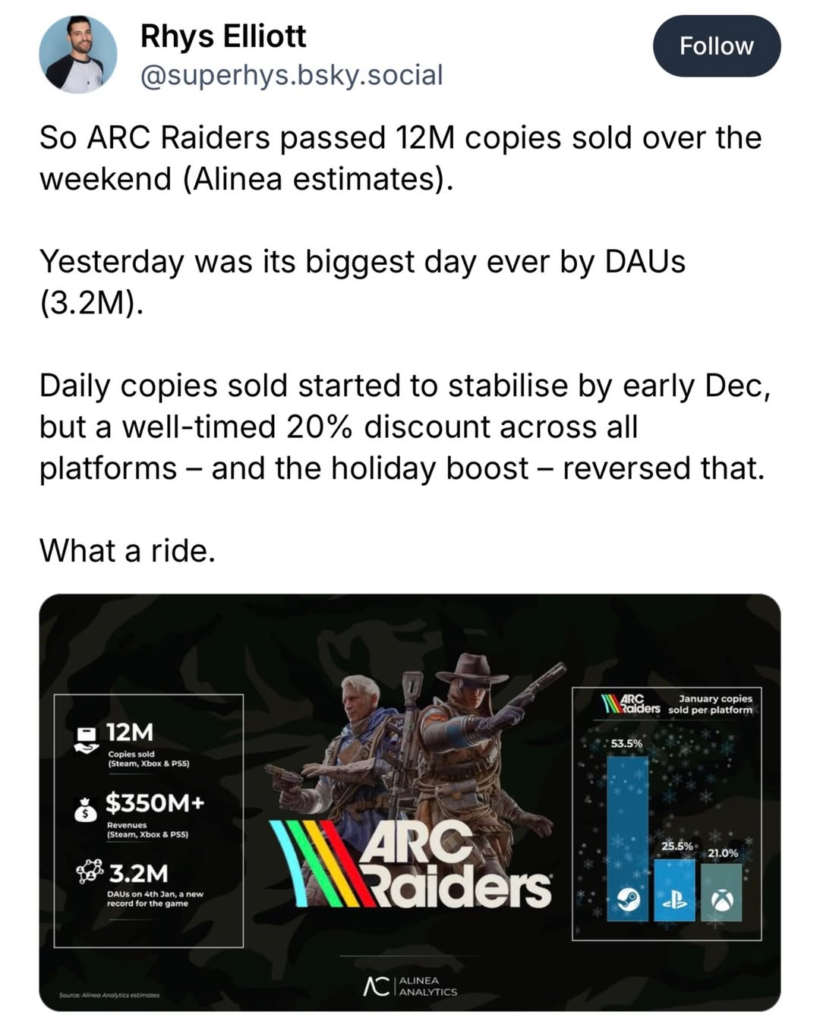 Alinea Analytics не має доступу до внутрішніх даних Embark Studios, але раніше її прогнози щодо продажів виявлялися точними. Зокрема, аналітики правильно визначили, коли Arc Raiders досяг 2,5 мільйона продажів, а Battlefield 6 подолав позначку 7 мільйонів продажів лише через п’ять днів після релізу.
