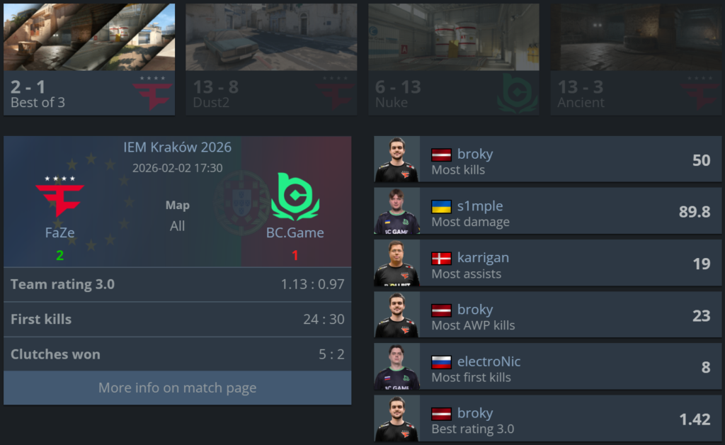 Після вдалого старту у першій стадії BC.Game не змогли продовжити серію перемог і залишають IEM Krakow, посівши 13-16-е місце, після поразки від FaZe у нижній сітці групи B.