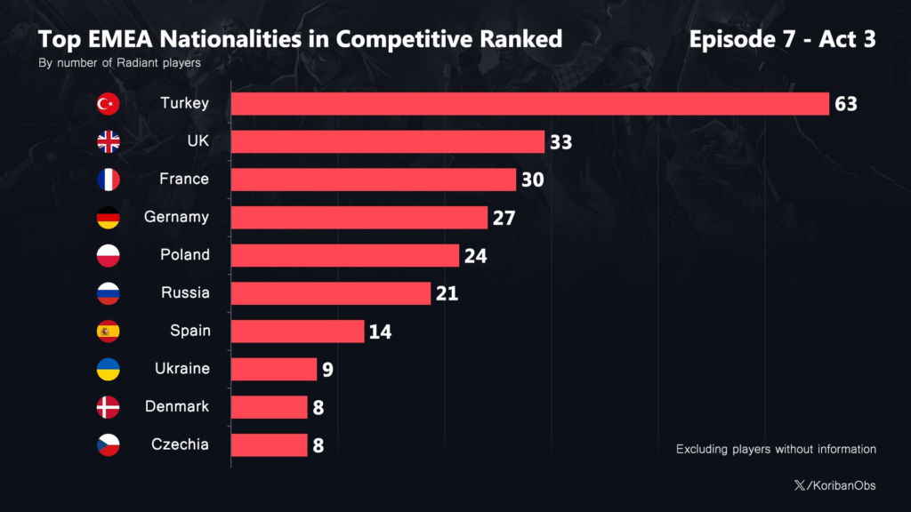 Найбільше гравців з рейтингом Radiant на завершення третього акту сьомого епізоду з Туреччини – 63. Найближчими до Туреччини є Сполучене Королівство та Франція, в них 33 та 30 гравців відповідно.