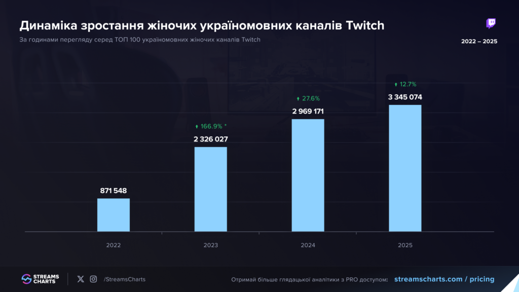 У період з 2022 по 2025 рік обсяг жіночих україномовних трансляцій на Twitch зріс майже в чотири рази — з 870 тис. до 3,34 млн годин перегляду. Найбільший приріст був у 2023 році, але позитивна динаміка продовжує зберігатися.