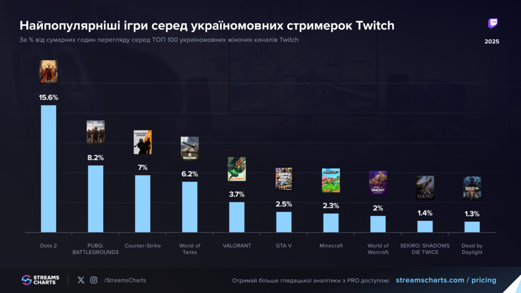 Уже другий рік поспіль найпопулярнішою грою серед україномовних дівчат-стримерок є Dota 2 — вона має понад 15,6% від загальної кількості всіх жіночих ігрових трансляцій у мовному сегменті Twitch.