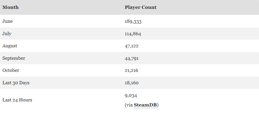 За даними SteamDB, у липні кількість гравців впала на 39,3%, що є типовим для нових релізів, коли спадає початковий ажіотаж. Проте далі ситуація лише погіршувалася: у серпні пік знизився ще на 59%, до 47 тисяч користувачів. У вересні темпи спаду дещо стабілізувалися (–4,9%), але вже в жовтні гра знову втратила понад половину гравців (–52,6%).