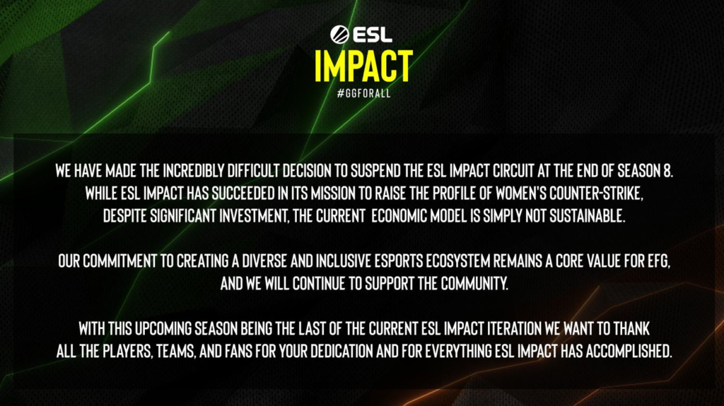 Організатори ESL Impact — ініціативи, спрямованої на розвиток жіночого кіберспорту в дисципліні Counter-Strike — офіційно оголосили про завершення турнірної серії після 8 сезону. У заяві ESL зазначено, що попри успіхи у підвищенні впізнаваності жіночих команд та значні інвестиції, економічна модель проєкту виявилася неспроможною для подальшого існування.