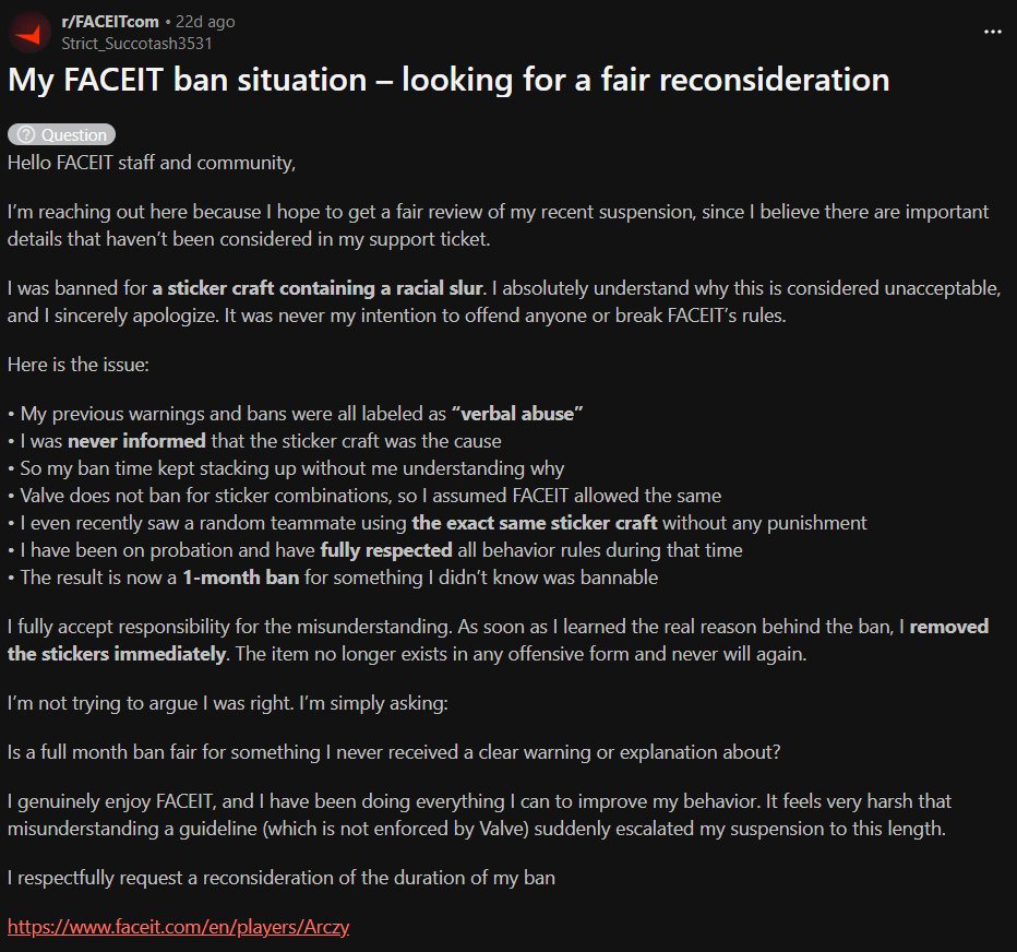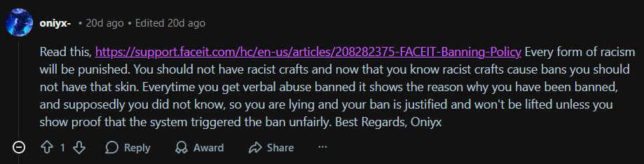 Один із співробітників FACEIT у відповіді на публікацію зазначив: будь-яка форма расизму карається. Гравці не повинні використовувати расистські крафти, і тепер, коли вони знають, що такі скіни призводять до банів, вони повинні їх видалити. Кожен бан за словесні образи показує причину блокування, і якщо гравець стверджує, що не знав причину, FACEIT вважає це неправдою, а бан — обґрунтованим, який не буде скасовано, якщо не надано доказів несправедливого спрацьовування системи.