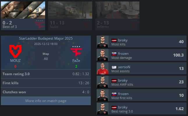 FaZe здолали MOUZ у чвертьфіналі StarLadder Budapest Major 2025 з CS2. Матч завершився з рахунком 2:0 (13:11 на Nuke і 13:2 на Inferno).