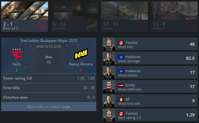 FaZe Clan, які розпочали StarLadder Budapest Major 2025 з першої стадії, стали другими фіналістами чемпіонату. У півфіналі команда здобула перемогу над NAVI з рахунком 2:1 (5:13 на Ancient, 13:11 на Nuke і 13:8 на Inferno).