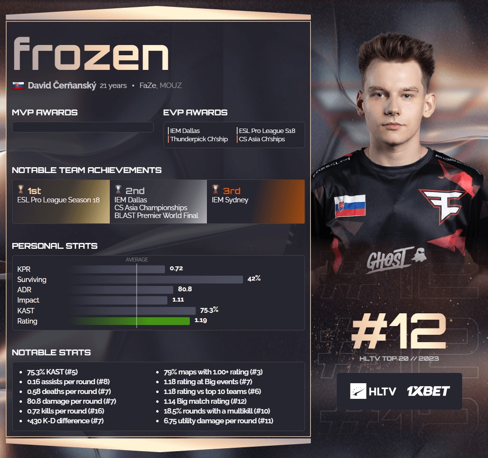 Гравець FaZe Давид frozen Чернянський посів 12-те місце в рейтингу кращих гравців з CS:GO/CS2 у 2023 році за версією порталу HLTV. Його середній рейтинг за рік склав 1.19, а також він має 79% мап з рейтингом вище 1.00.