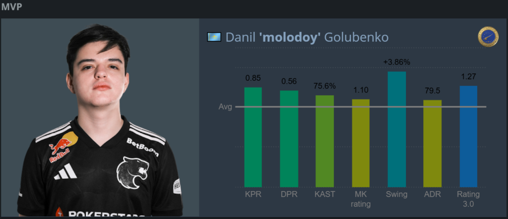 На Ancient колектив із Південної Америки дотиснув суперника 13:11, на Inferno зберіг мінімальну перевагу — 13:10, а на Overpass знову довів справу до перемоги 13:11. Найяскравішим гравцем фіналу став снайпер FURIA Данило "molodoy" Голубенко, який завершив серію з 61 фрагом — найкращим показником серед усіх учасників матчу. Крім того, molodoy став MVP турніру за версією HLTV - це друга нагорода в кар'єрі казаха.