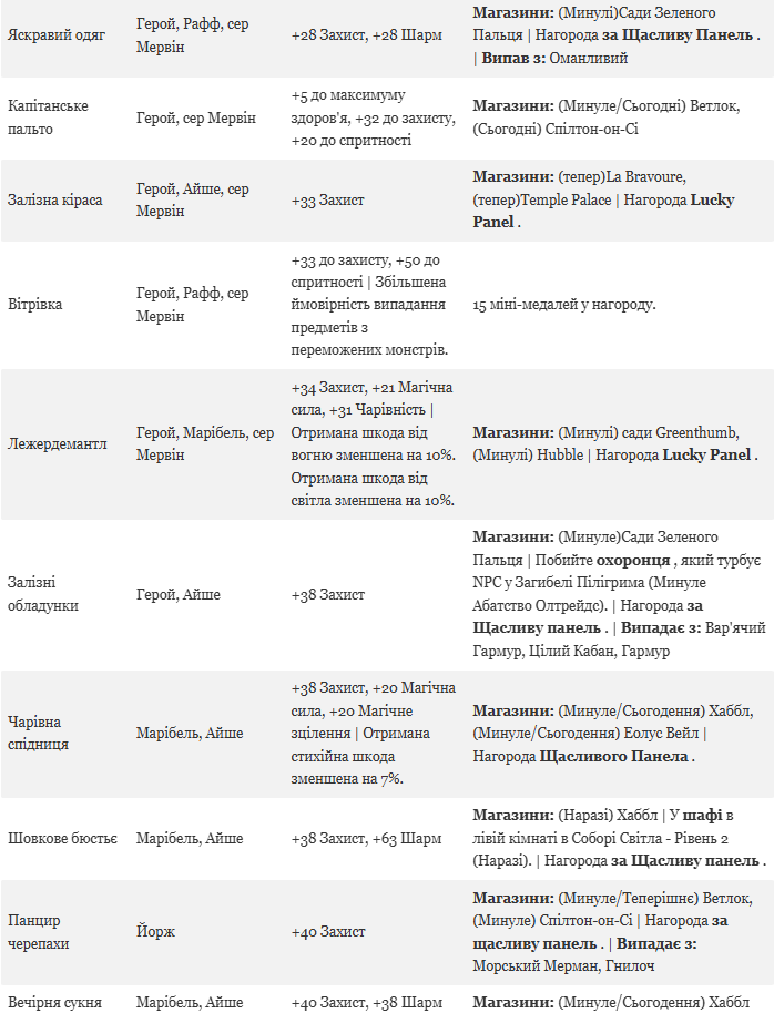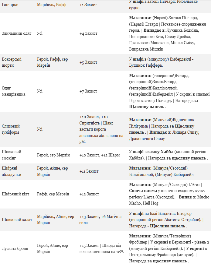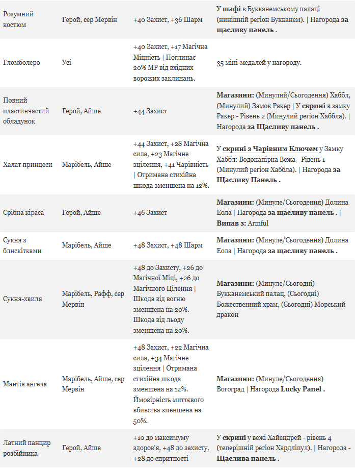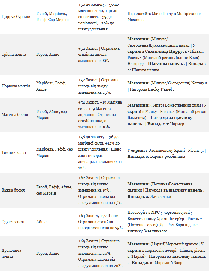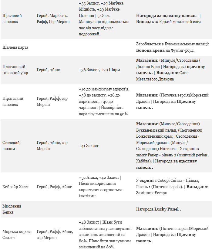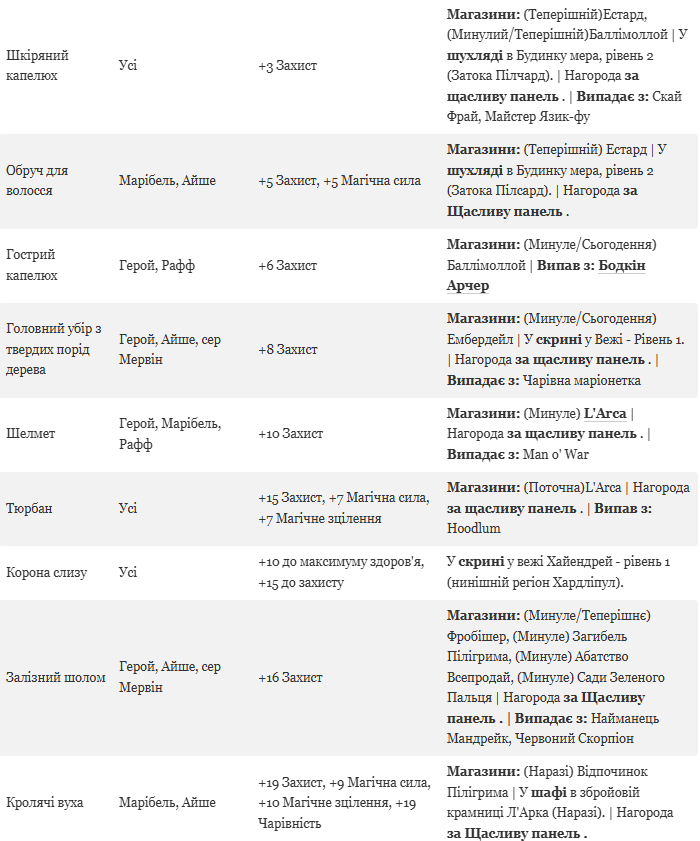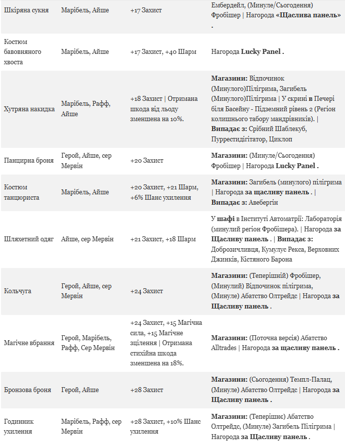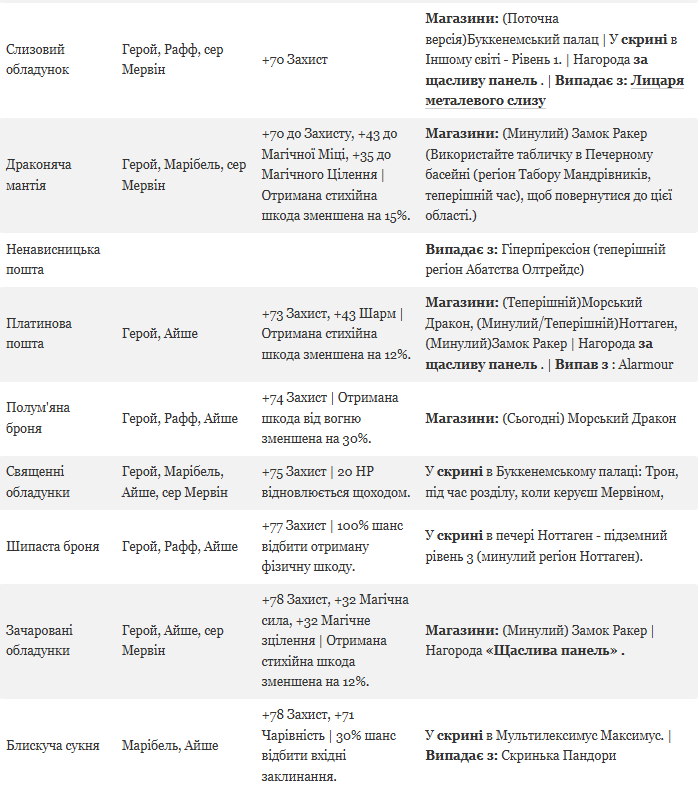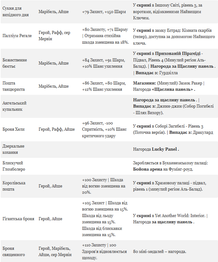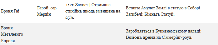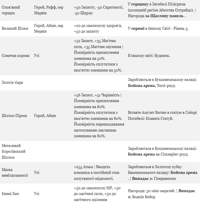 Список нижче повторює порядок із внутрішніх списків гри для шоломів та броні. Переглянути їх можна через інформаційне меню. Це зручний спосіб перевірити, яких предметів у колекції ще бракує.