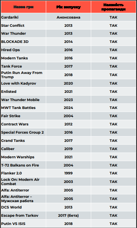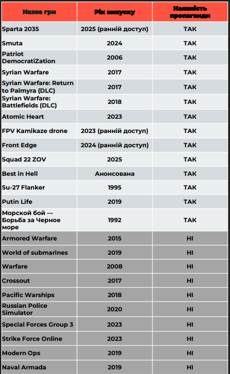 Українська команда Games Gathering за підтримки Українського культурного фонду опублікувала дослідження про пропаганду у російських відеоіграх за останні 30 років. Фахівці проаналізували 50 ігор і виявили пропагандистські наративи у 40 з них. Дослідження охоплює сюжети, діалоги, візуальний та аудіоряд, маркетинг і зв’язки з державними структурами.