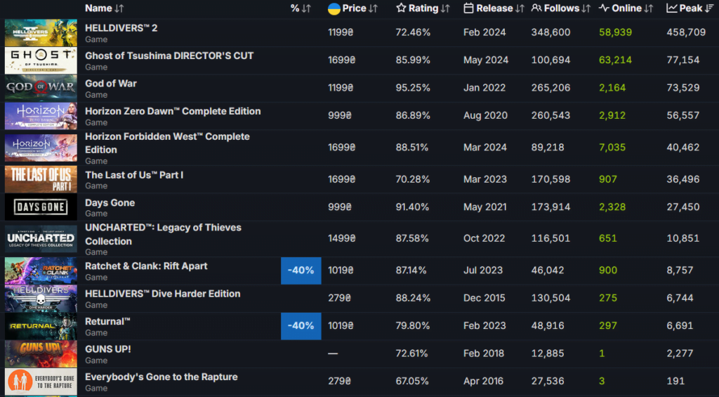 Серед всіх ігор PlayStation Studios, які доступні на ПК, найуспішнішою є кооперативна Helldivers 2, в яку в піку грало 458.7 тис. гравців.