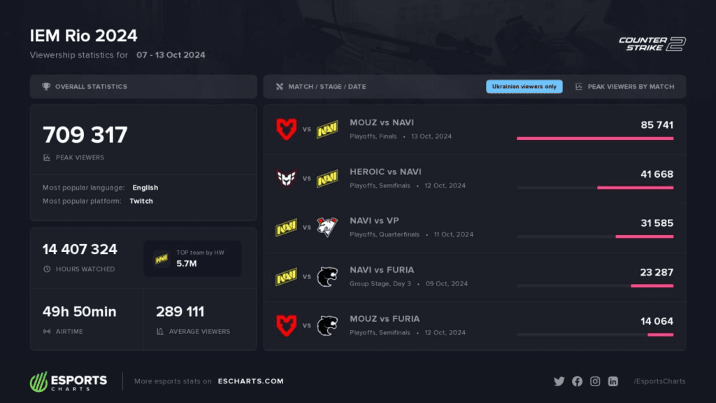 Українськомовну трансляцію вирішального матчу IEM Rio 2024 з CS2, в якому грали NAVI і MOUZ, в піку дивилося 85.7 тисяч глядачів. Про це свідчать дані порталу Esports Charts.