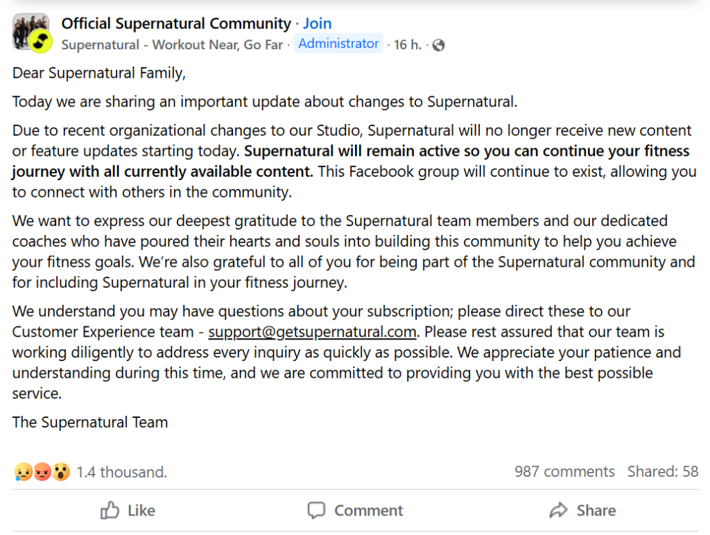 У заяві на Facebook розробники повідомили що через нещодавні організаційні зміни Supernatural більше не отримуватиме новий контент або функціональні оновлення.
