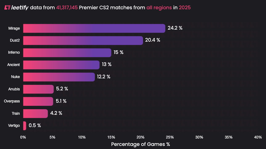 За результатами аналізу Leetify, у прем’єр-режимі CS2 у 2025 році на Mirage було зіграно майже 10 мільйонів матчів, що становить 24,2% від загальної кількості ігор. Це робить її беззаперечним лідером серед усіх карт.