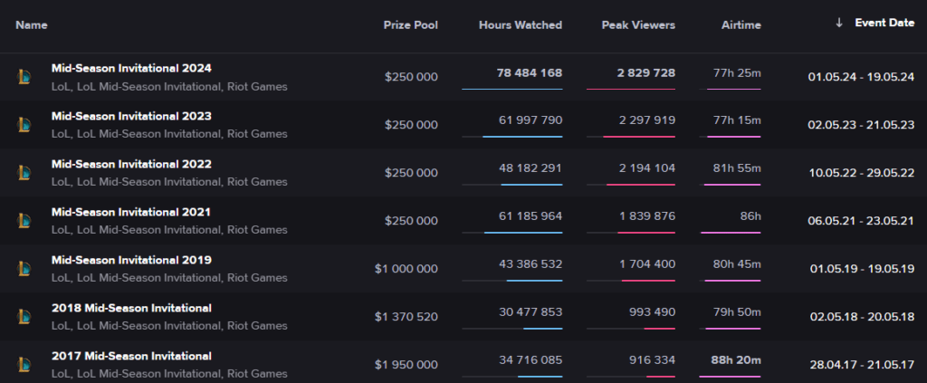 MSI 2024 став першим турніром в серії за піковим онлайном. Раніше лідирував минулорічний MSI, який у піку дивилося 2.2 млн фанатів.