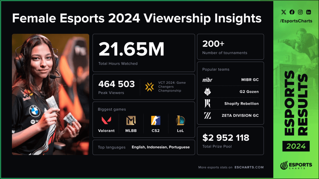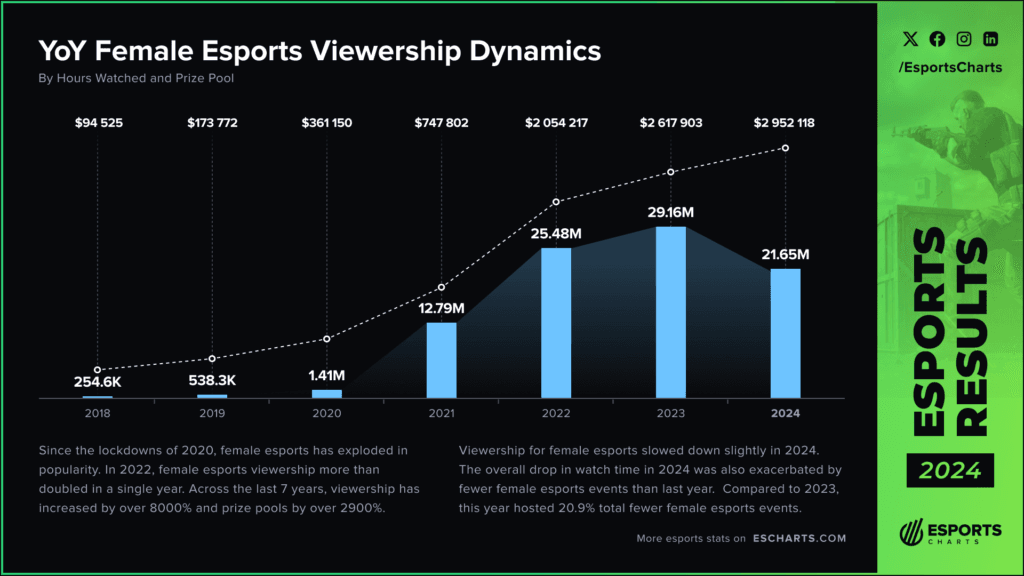 Esports Charts відзначили, що з 2021 року жіночий кіберспорт почав активно рости. У 2024 році відбулося падіння загального часу переглядів, це пояснюється тим, що у 2024-му було проведено на 20% турнірів менше у порівнянні з 2023-м.