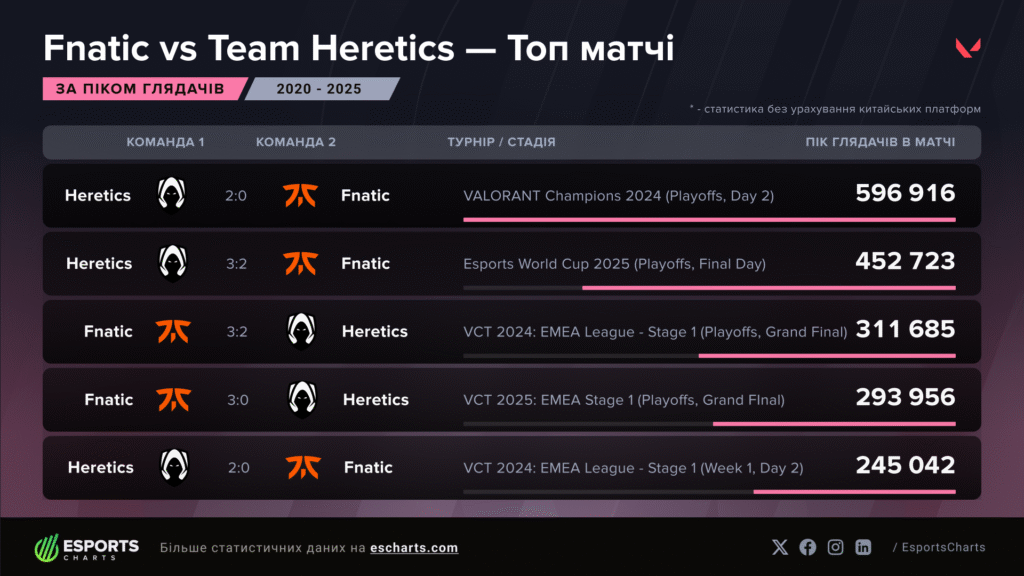 Fnatic і Team Heretics — одні з найсильніших команд Європи з Valorant, які регулярно представляють рідний регіон на міжнародній арені. Один з одними вони грають теж досить часто, в тому числі й в ключових матчах: Fnatic двічі обігравала Team Heretics у гранд-фіналах на VCT 2024: EMEA Stage 1 і VCT 2025: EMEA Stage 1, тим самим здобуваючи статус найсильнішого клубу регіону. У свою чергу, Team Heretics чудово відіграла на Esports World Cup 2025, де у вирішальному матчі якраз здолала Fnatic з рахунком 3:2. Для іспанської команди це став перший великий міжнародний трофей після приходу в Valorant.