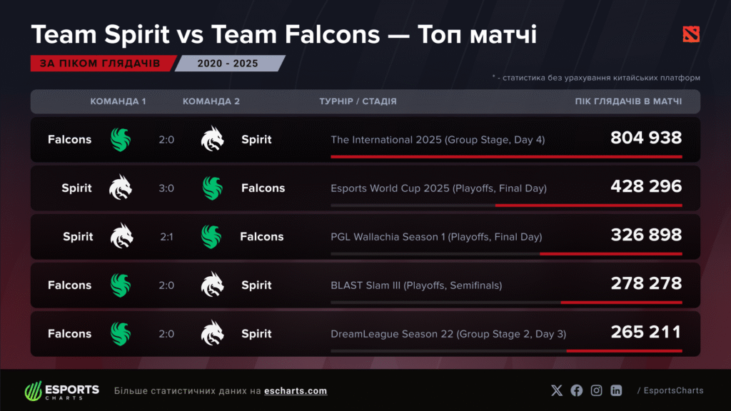 Всього за два роки (2024 - 2025) Team Falcons і Team Spirit провели на турнірах 26 офіційних матчів. Саудівський клуб виграв 14 серій, проти 10 серій у суперників. Ще два поєдинки між ними закінчилися внічию. Можна сказати, що це одне з найбільш “рівних” протистоянь в сучасній Dota 2.