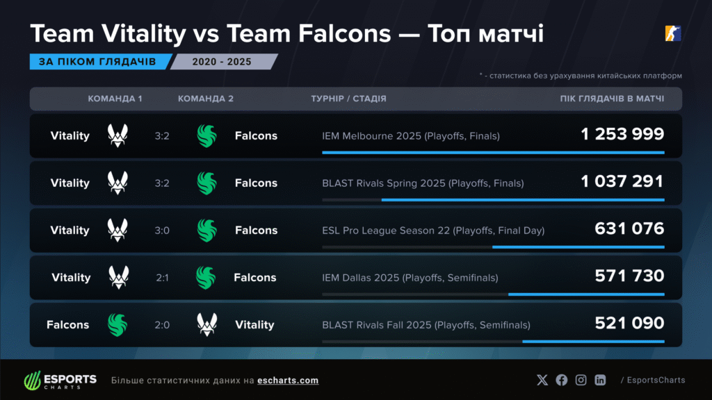 На шляху до чемпіонських титулів у Team Vitality було багато суперників, але найяскравішими протистояннями стали її ігри проти Team Falcons. Ці команди зустрілися у фіналах двох поспіль турнірів: IEM Melbourne 2025 і BLAST Rivals Spring 2025. Обидва матчі Team Vitality виграла з рахунком 3:2. Після цього був півфінал IEM Dallas 2025, де французи теж здобули перемогу. Falcons були сильнішими в матчі за третє місце на Esports World Cup 2025, але потім знову програли Vitality у фіналі ESL Pro League Season 22. Нарешті, остання зустріч команд у півфіналі BLAST Rivals Fall 2025 закінчилася перемогою Falcons.