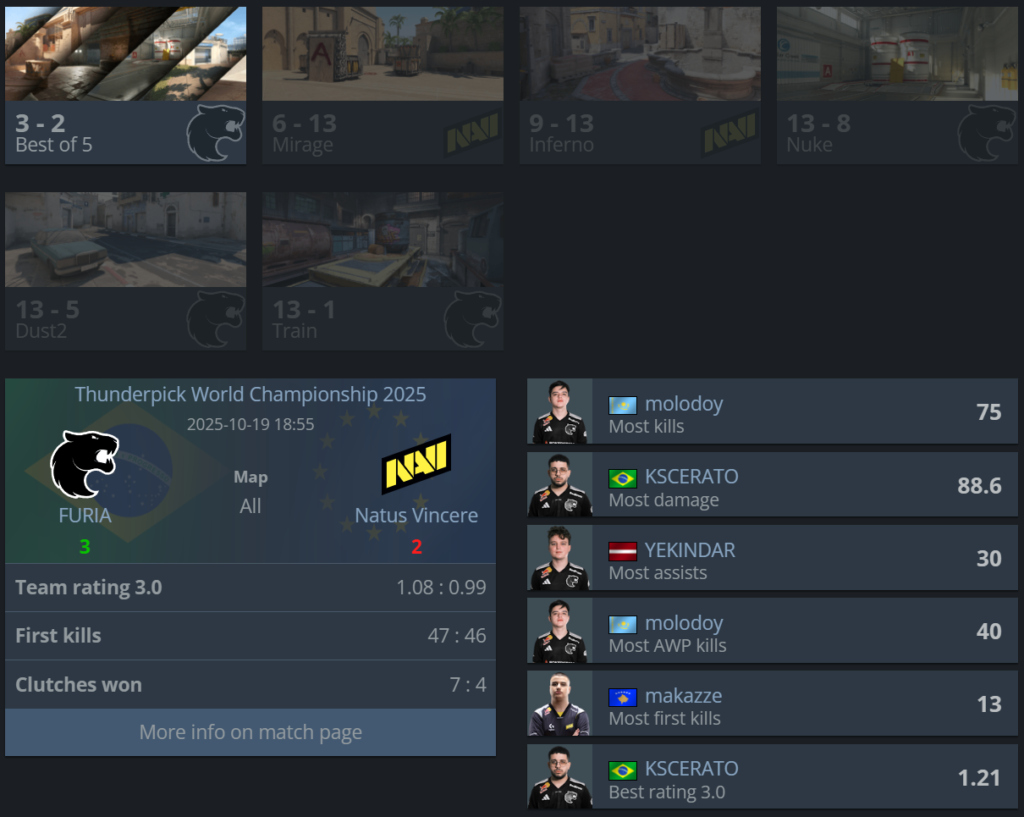 Після провалу на Mirage та Inferno, FURIA ожила на Nuke завдяки FalleN і KSCERATO, а далі molodoy і YEKINDAR взяли гру у свої руки. Матч завершився історичним камбеком бразильської організації з рахунку 0:2.