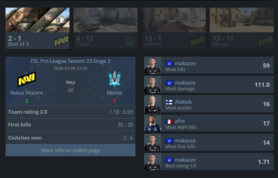 Сьогодні ця зустріч повторилася: команди обмінялися піками, а основна боротьба продовжилася на Mirage, який став десайдером. Перша половина завершилася з рахунком 6:6, але згодом Monte перехопили ініціативу та почали вести гру. Хоча NaVi виглядали слабшими, вони продовжували боротися і змогли здійснити камбек — у напруженій боротьбі на останніх раундах вони виграли третю мапу.