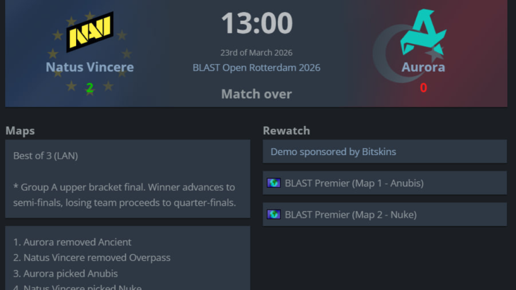 Цей матч був не на виліт, а за розподіл посіву: переможець розпочинає плей-оф із півфіналу, тоді як той, хто програє, стартує з чвертьфіналу. У підсумку NaVi забрали цей слот і розпочнуть свій шлях у плей-оф BLAST Open Rotterdam саме з півфіналу.