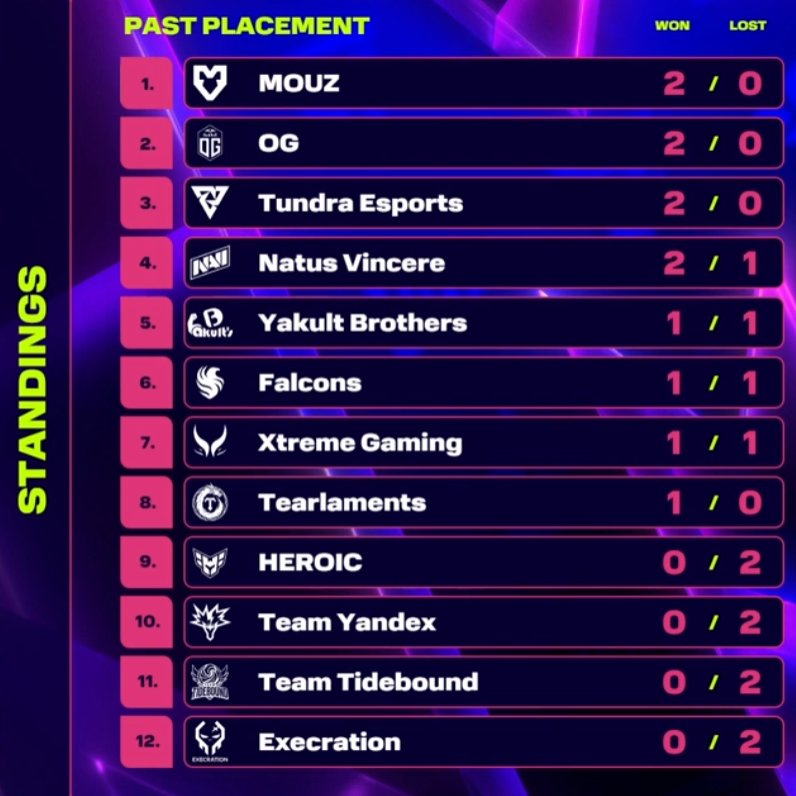 Після першого ігрового дня лідерами групи є MOUZ, OG і Tundra, але не всі команди мають рівну кількість матчів.