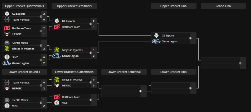 Саме проти GamerLegion NiP зустрілися у верхній сітці. «Ніндзя в піжамах», попри гарний старт і виграну мапу Nuke, не змогли дотиснути суперника та програли наступні дві, через що впали до нижньої сітки турніру. Українець r1nkle набив рейтинг 1.29, але цього не вистачило для перемоги.