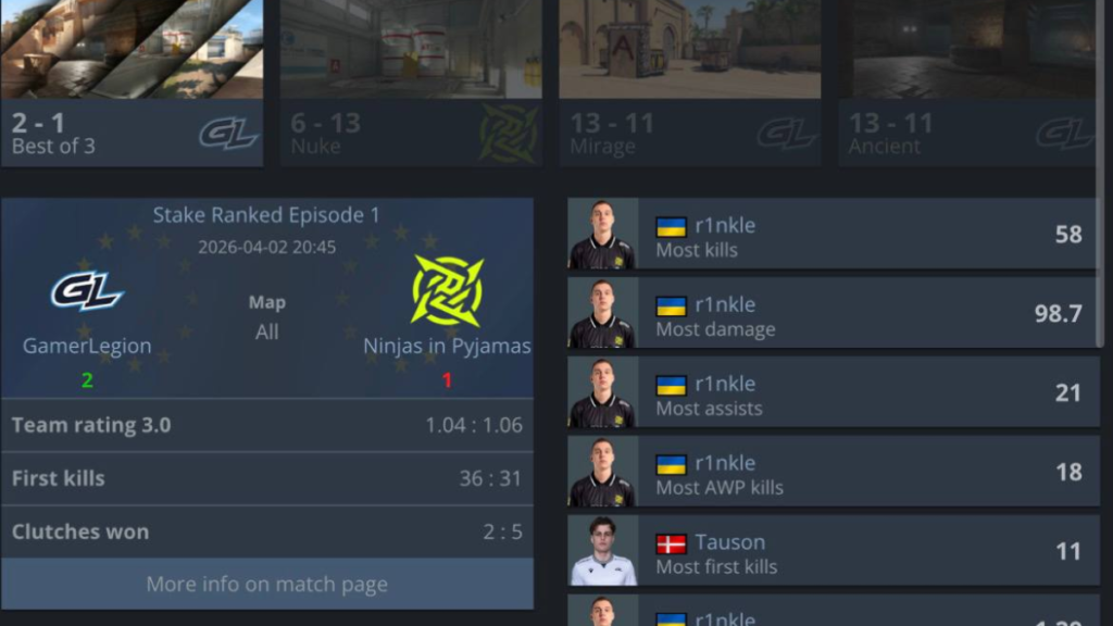 Саме проти GamerLegion NiP зустрілися у верхній сітці. «Ніндзя в піжамах», попри гарний старт і виграну мапу Nuke, не змогли дотиснути суперника та програли наступні дві, через що впали до нижньої сітки турніру. Українець r1nkle набив рейтинг 1.29, але цього не вистачило для перемоги.