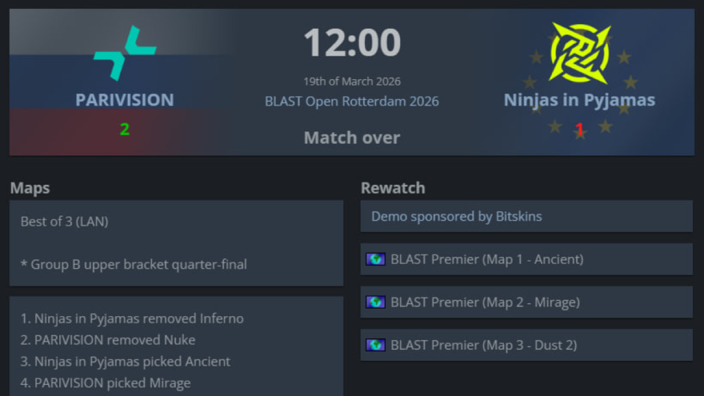 NIP, які мають у складі двох українців, розпочали свій шлях на BLAST Open Rotterdam 2026. Їхнім першим суперником у верхній сітці стали PARIVISION, які демонструють одні з найкращих результатів цього року, але водночас залишаються досить нестабільними.