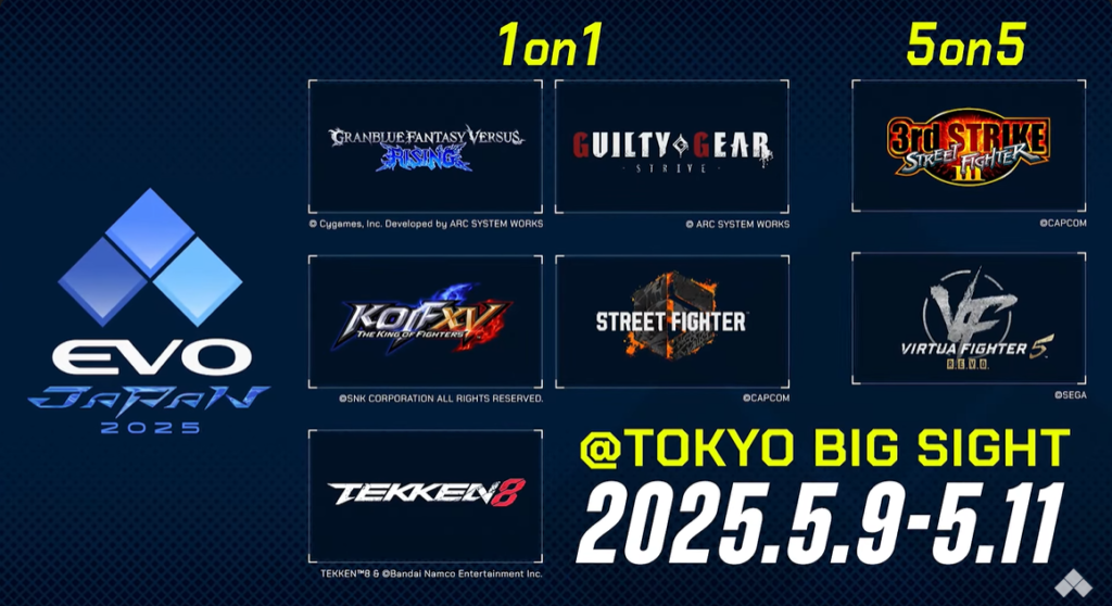 EVO Japan 2025 відбудеться з 9-го по 11-те травня на критому майданчику Tokyo Big Sight East Exhibition Halls в Токіо, Японія. Раніше на цьому ж майданчику проводили EVO Japan у 2023 році.