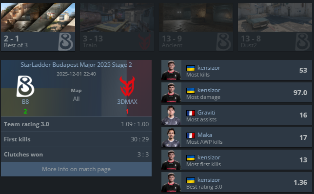 Матч за вихід у Stage 2 між B8 і 3DMAX почався з розгромної перемоги французької команди на Train з рахунком 3:13. Після цього на Ancient українці змогли продемонструвати кращу гру і здобути перемогу 13:9, що дозволило зрівняти рахунок в серії.